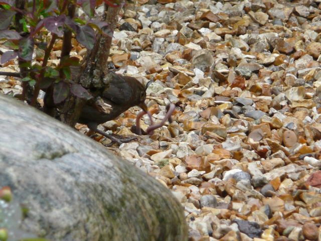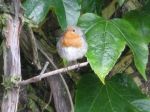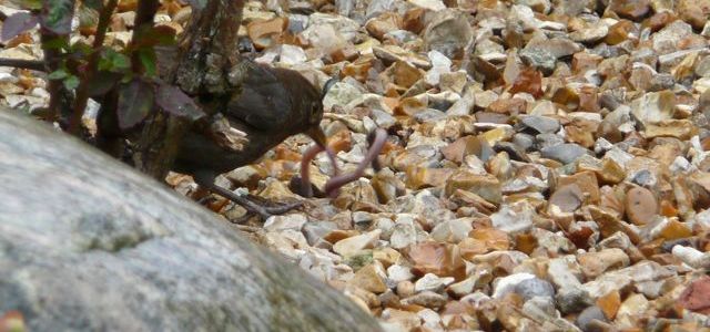 The Mother Blackbird, we think, has hatched her 2nd brood, and the Robin is still feeding its fledgling (which looks bigger than the parent).
