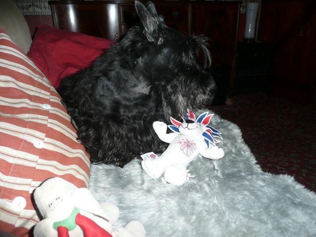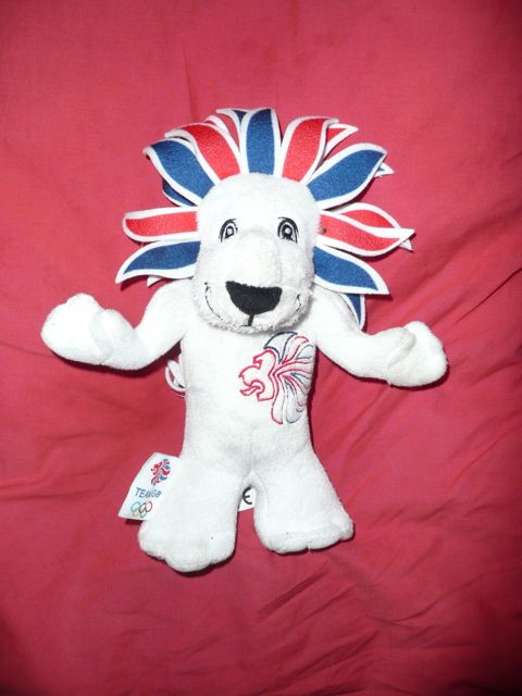 So, Dad went to London on Friday (reception at the Canadian Embassy, He got to wear a Silver Medal, offered him by a Canadian Rower – how cool is that – not that much in our doggie eyes!) and then he went to the Olympic Shop where he purchased Lio for Fin and a t-shirt for Her. Notice that me, Bobby got nothing!