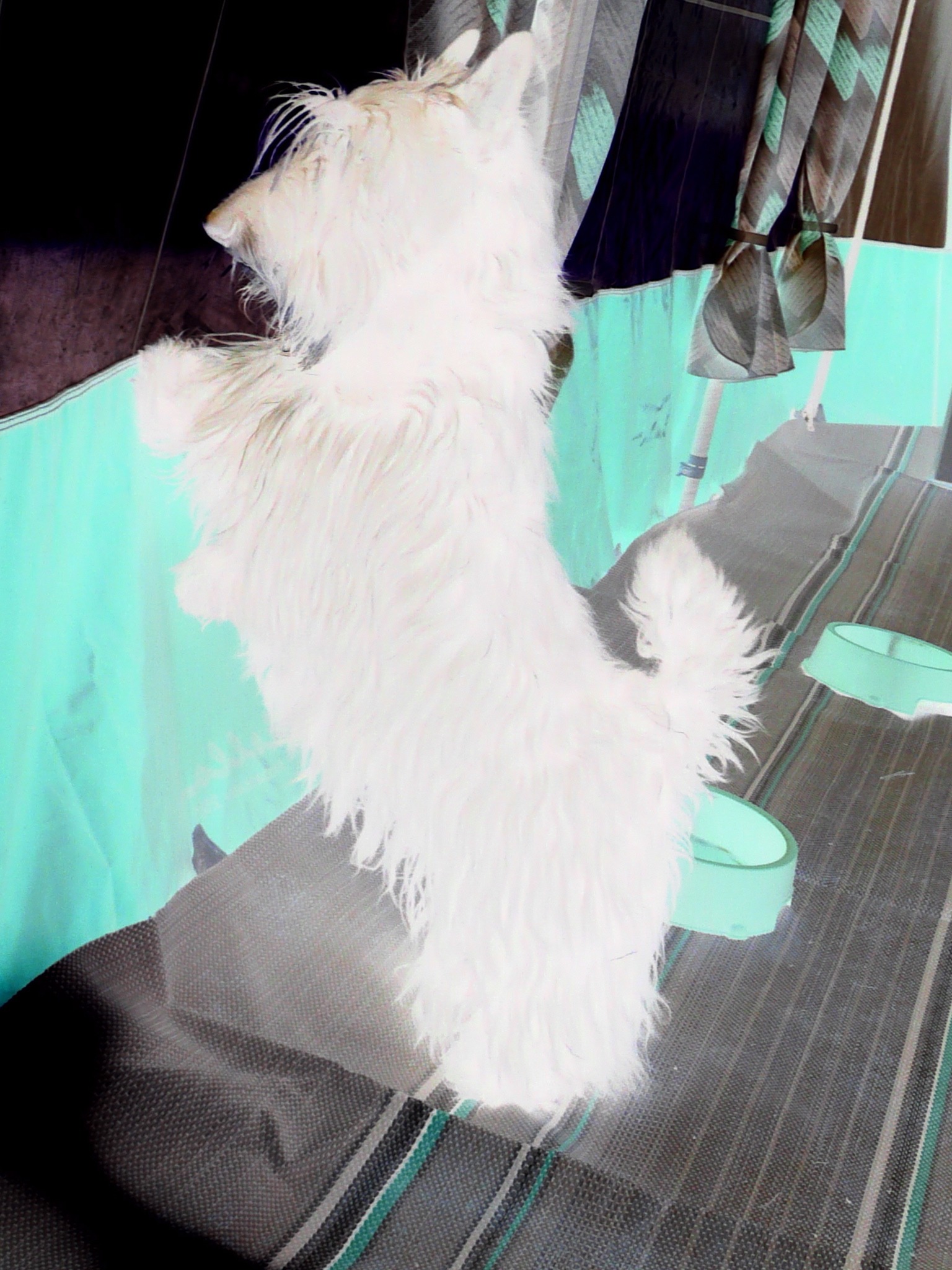 Thought I’d try something different on Thursdays, for a while. Not posted Foto Funs for some time now. Thought it would be a change from Thirsty Thursdays – but hey! you guys know just how much I love slurping from rivers, streams, puddles and my own drinking bowl when we go walking, so I won’t be abandoning my Thirsty Fotos just yet. And anyway, I’ve been teaching Fabi to slurp in those same places. Anyway, back to my Foto Fun. This was taken in my awning during one of our motorhome camping trips – don’t you think I look rather spooky?