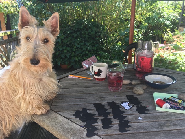 It’s Scotifyday – we’re introducing our new website http://www.scotify.dog where we display our scottie-based art. We’d like folks to buy some of it, but it’s no problem if all you do is look. We just like making ‘stuff’ especially if there’s scotties all over it. Anyway, here’s Alba in the process of making ‘stuff’ …..