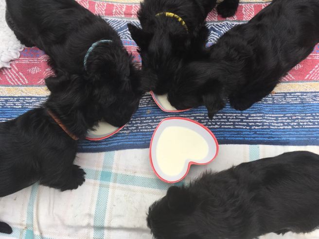 Scottie pups love their water …. the wet patch surrounding them is what happens to the remaining water – they either run through it, or dig it out !!!